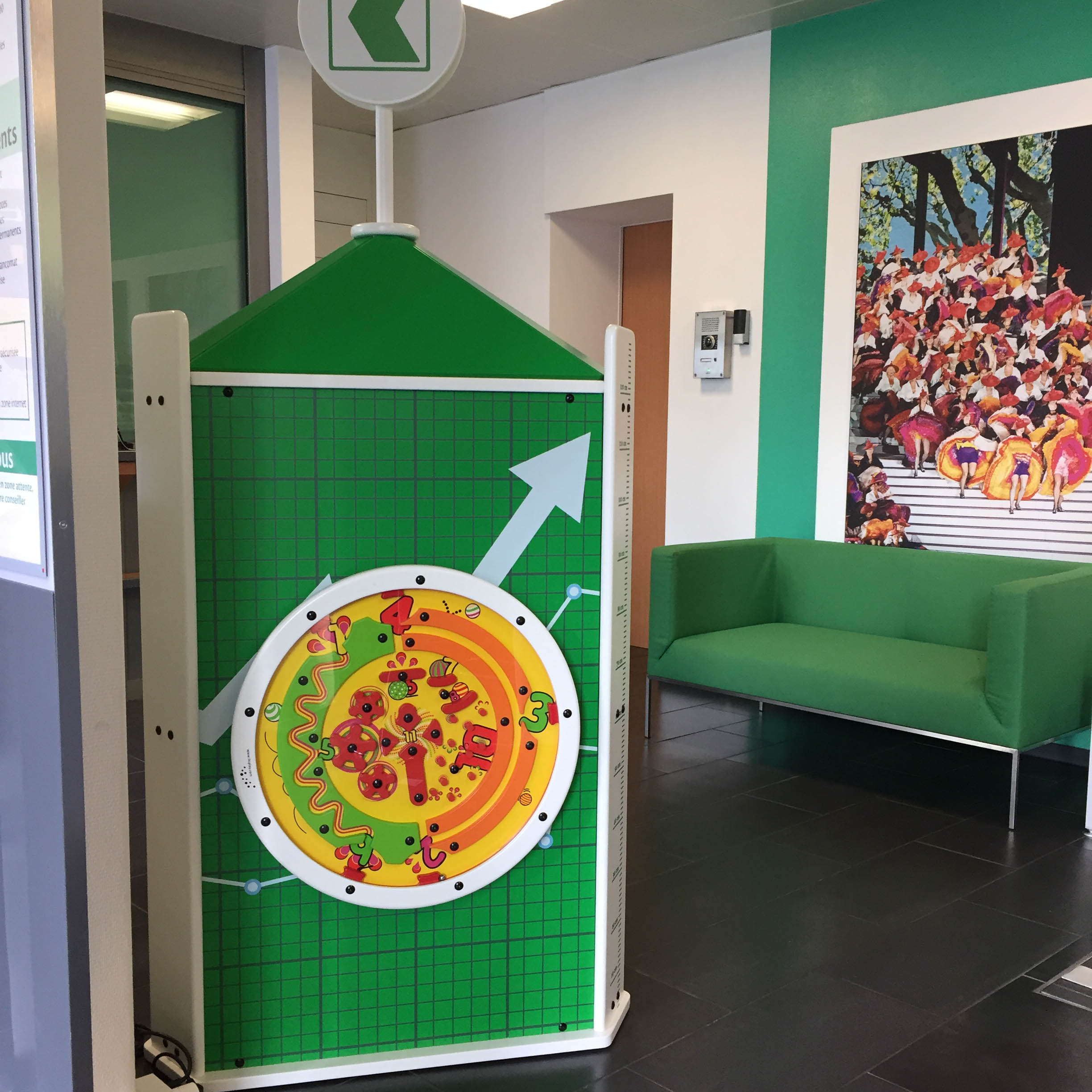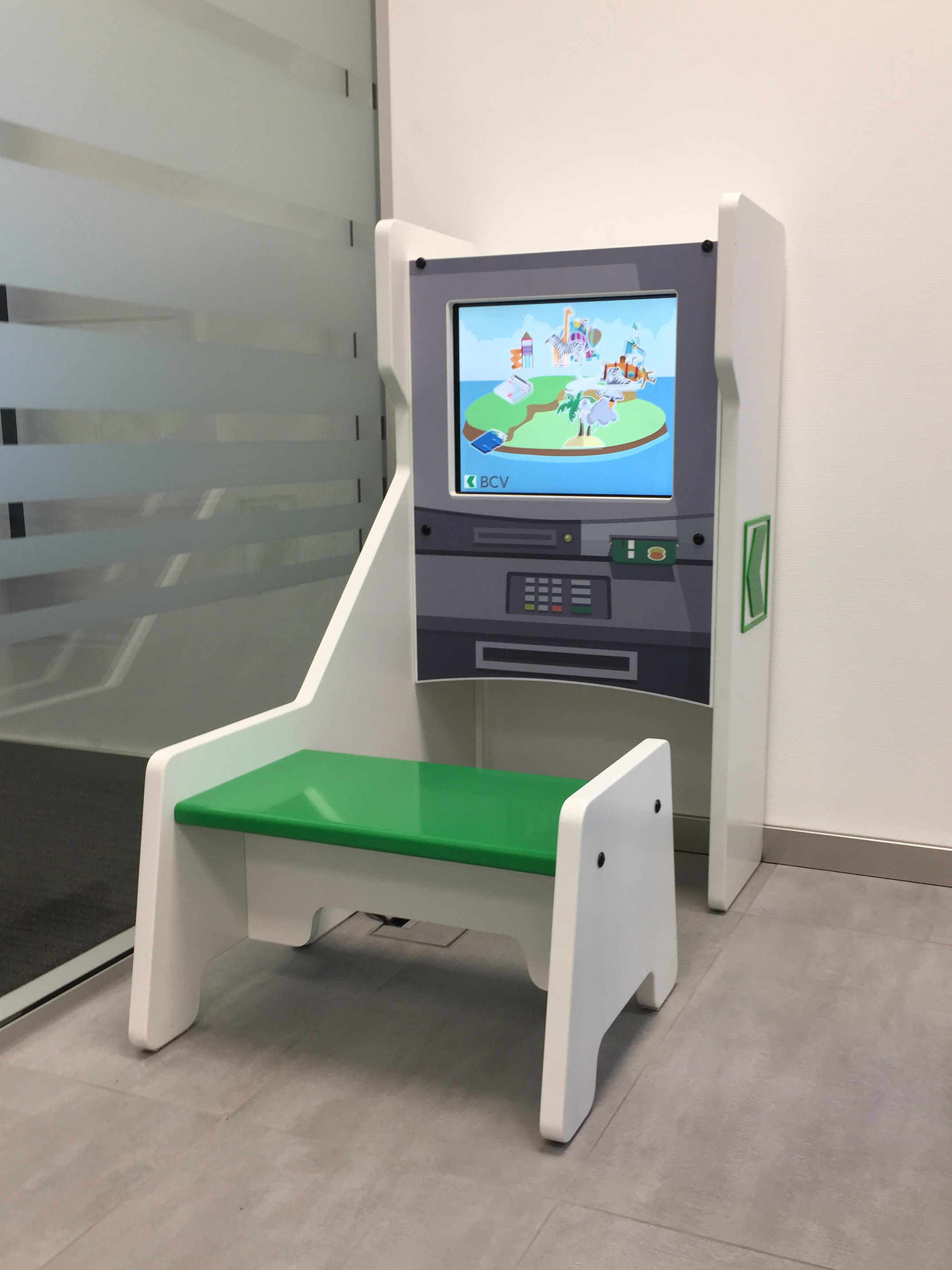 Da die BCV-Spielecken sowohl zum Thema „Geld“ als auch zum Firmen-Design der Bank passen, fügt sich alles perfekt in das Interieur der Filialen ein.