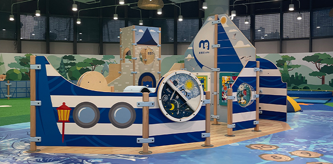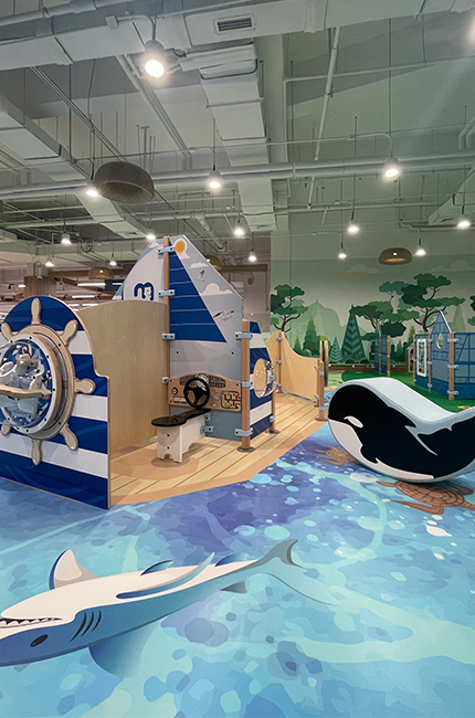 Este enorme rincón infantil tiene una superficie de 280 m2 y está lleno de todo tipo de divertidos sistemas de juego. Este mundo de fantasía cobra vida gracias a las maravillosas decoraciones de las paredes y el suelo con bosques, así como a una playa en la que se encuentra el verdadero punto de atracción de esta sala de juegos: ¡un enorme barco de juguete! En el barco, los niños pueden explorar todos los rincones para encontrar todo tipo de juegos de pared y vallas de juego con volantes incorporados, ventanas y otros divertidos elementos.