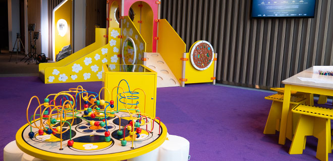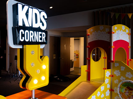 Los rincones para niños se han diseñado especialmente para el cine y encajan perfectamente en el estilo de la marca Pathé y con sus elementos reconocibles. La mascota Charlie se ha incorporado a varios gráficos y al software.