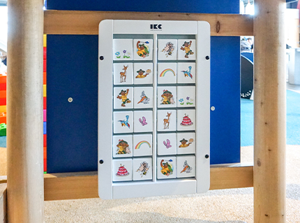El juego de pared Memory ha sido personalizado por nuestro departamento de diseño. En la parte posterior de los bloques está impreso el reconocible logotipo de Landal Strand Resort Ouddorp Duin. Al otro lado de los bloques están las imágenes que los niños pueden emparejar. Estos también están personalizados para Landal. Por ejemplo, Bollo se puede encontrar varias veces en ellos, pero también aparecen sus amigos. El rincón de juegos está hecho para niños pequeños, ¡pero los niños mayores también se pueden encontrar regularmente en la zona para niños pequeños!