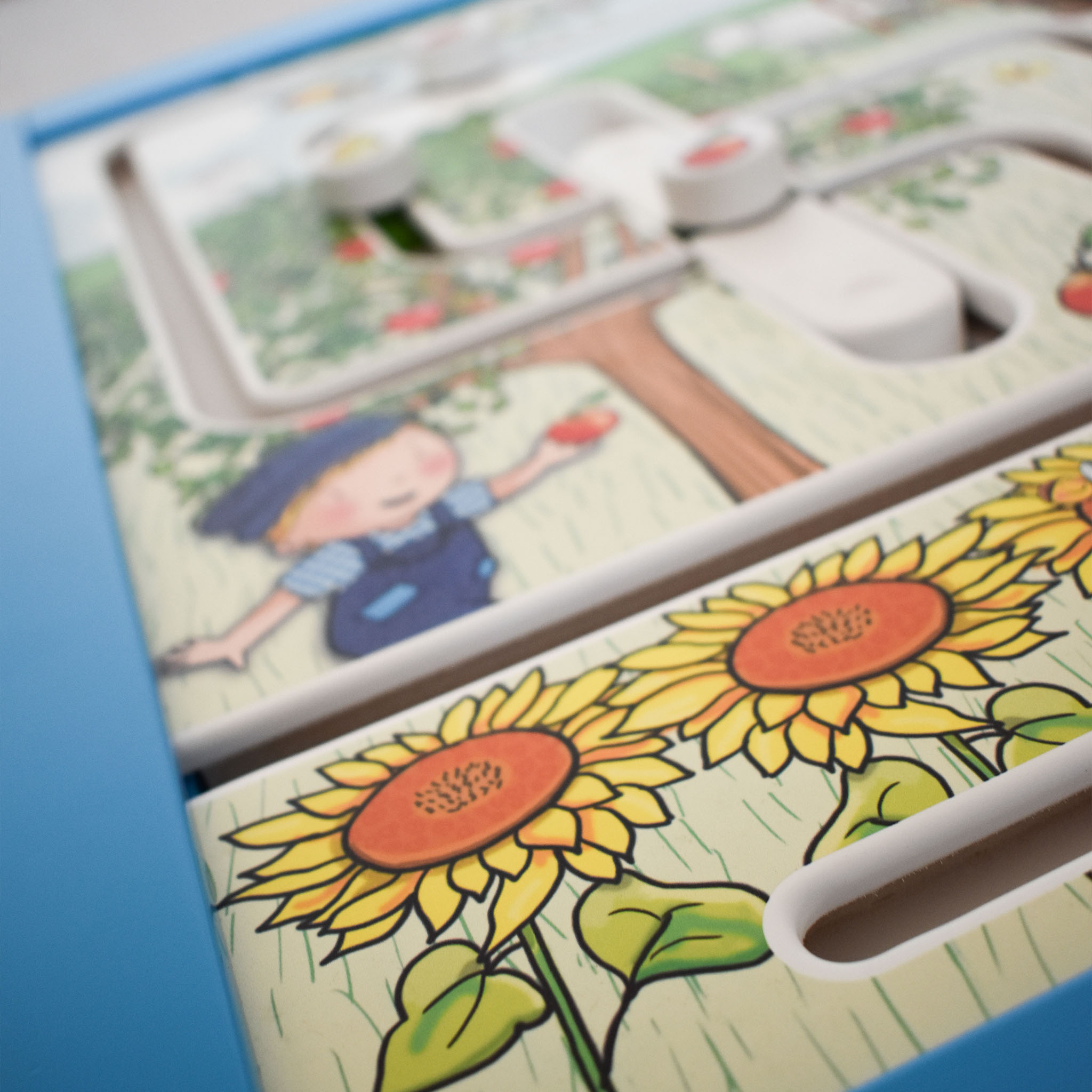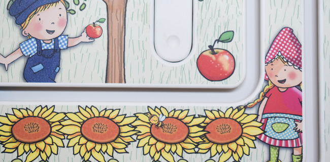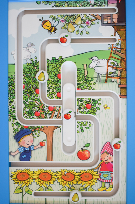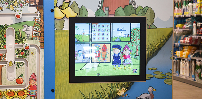 Après avoir obtenu la permission spéciale des créateurs de Fien & Teun, nous avons conçu ce coin de jeux spécial pour les enfants sur le thème de la vie à la ferme. Nous avons transformé notre jeu mural Apple Pie Factory en un jeu spécial Fien & Teun où les enfants peuvent apprendre à trier les pommes et les poires. En outre, il y a également un écran tactile moderne et interactif avec toutes sortes d'informations. de mini-jeux amusants où vous trouverez également Fien, Teun et leurs amis les animaux.