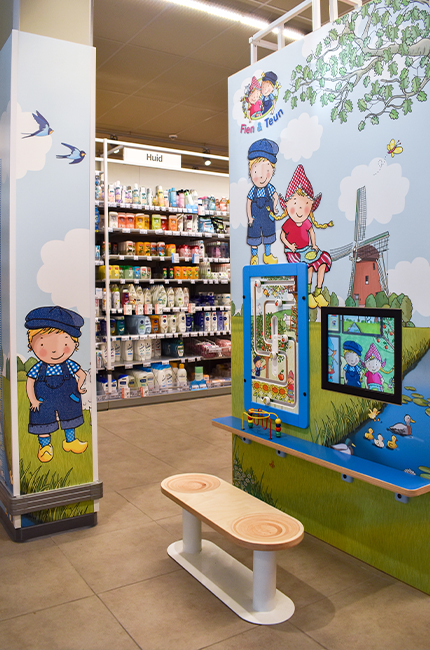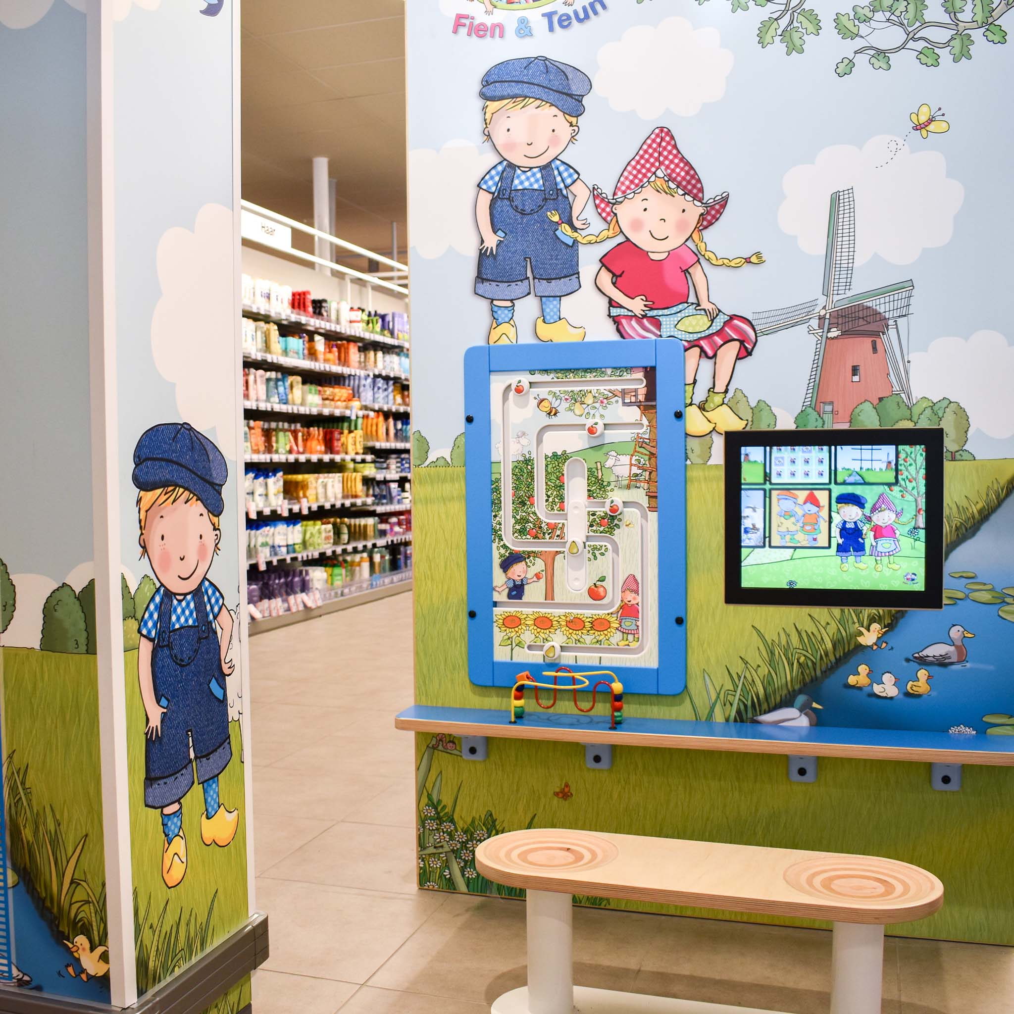 Parce que le directeur du supermarché Nick Rogmans voulait un coin de jeu unique et sur mesure pour les enfants qui viennent visiter son magasin, notre équipe IKC Design a relevé le défi et créé un espace en partant de quelques nouvelles idées. Cela a commencé par la conception d’une aire de jeux avec les mascottes hamster très reconnaissables d'Albert Heijn, qui s'est transformé en un thème très surprenant et inattendu grâce à quelques connexions spéciales dans le réseau du gérant : le populaire duo de télévision Fien & Teun!