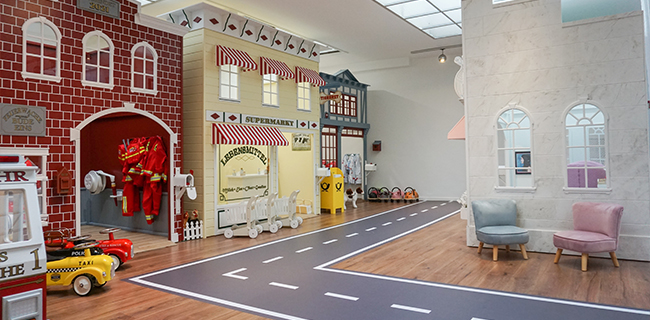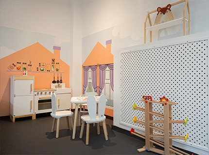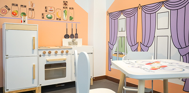 Pour rendre cet espace encore plus vivant, IKC a fourni plusieurs décors muraux conçus spécialement pour s’accorder au coin jeu. Il y a un mur avec une vue sur la rivière, ainsi qu’un coin jeu ressemblant à une véritable cuisine ! De plus, la petite cuisine contient également une table à manger meublée, réalisée à l’aide d’adhésifs détaillés.