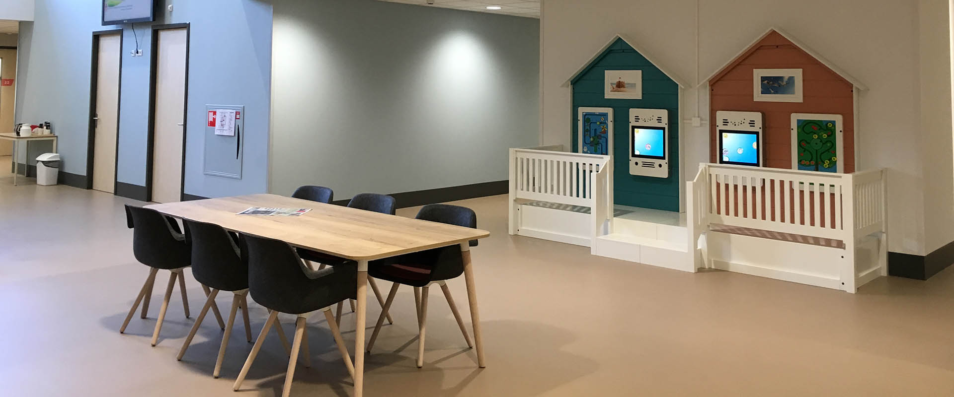 ロッテルダムにあるマースタッド病院は他と変わった仕様です。病院全体でプレイコーナーを全面に出し、患者さん全員に知ってもらう方法を取りました。ジャングルをテーマにこども家具と壁面ゲームをレイアウトした配置にし、小児科のキャラクターを病院中のプレイコーナーに描き、子どもたちがどの診療科でも親しみをおぼえ「受け入れられている」と感じてもらえるやり方です。