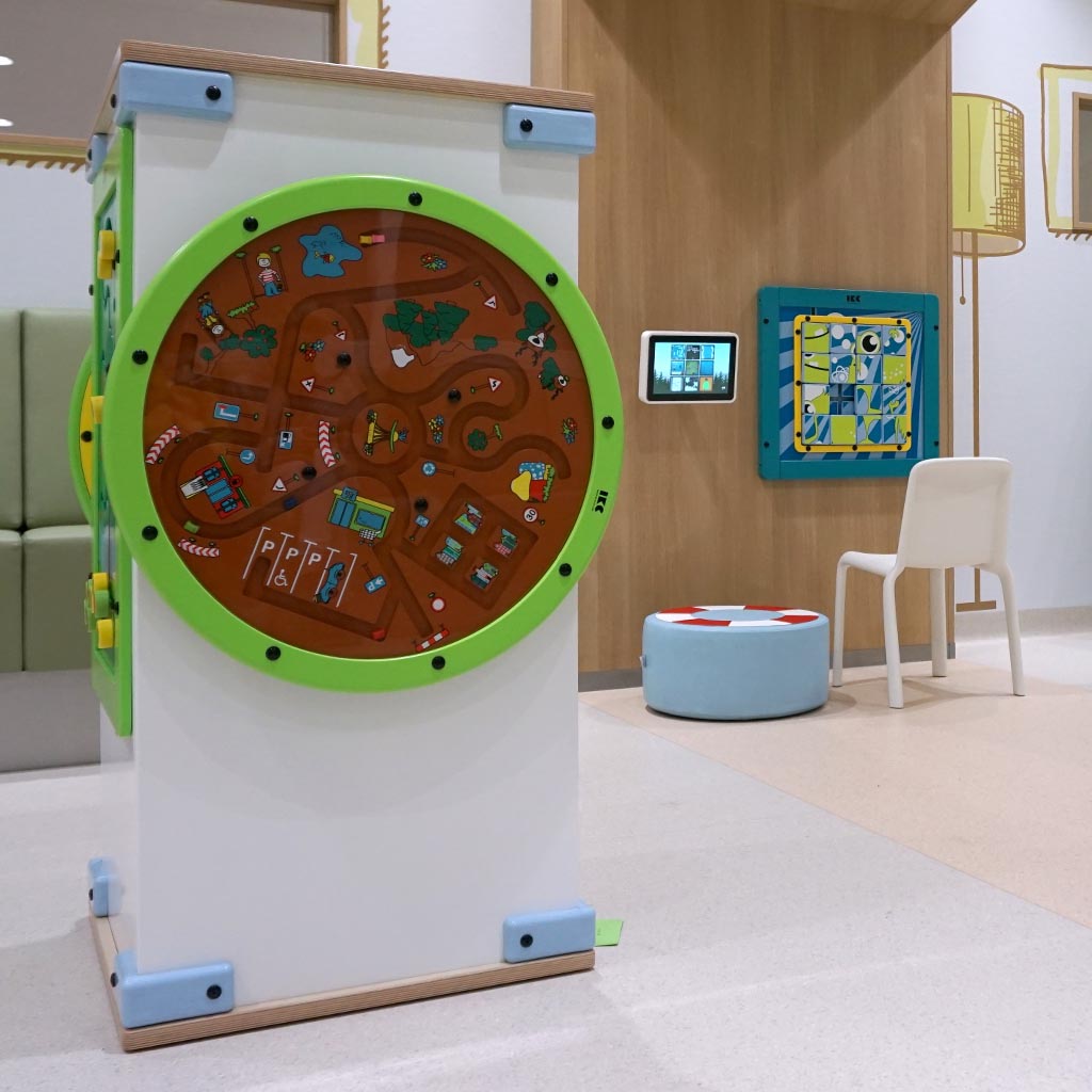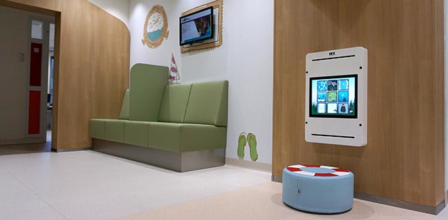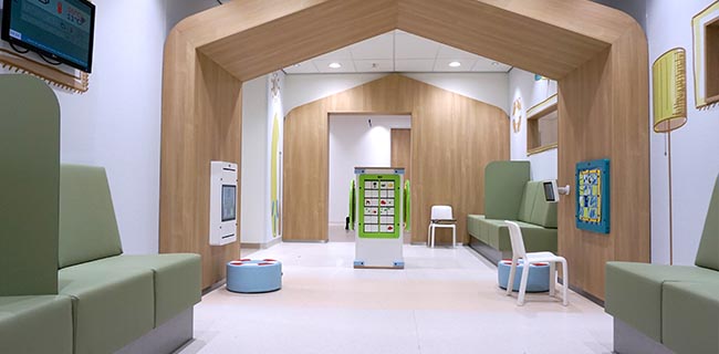 プレイモジュールの印象的な色彩は待合室を心地よく快適な空間に。あそぶことで子どもたちは気が紛れてリラックスできます。医師や看護師の先生方もその効果を診察中に実感しており、子どもたちが緊張せず落ち着いているので診察や治療が効率よくスムーズにできるようになったと話します。