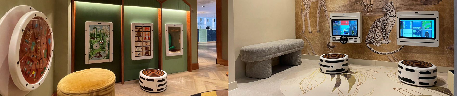 Om de beleving compleet te maken, ontwerpen wij iedere duurzame speelhoek volledig in uw eigen stijl. Van de kleuren van uw merk tot het logo in de digitale spellen — alles wordt op maat gemaakt.