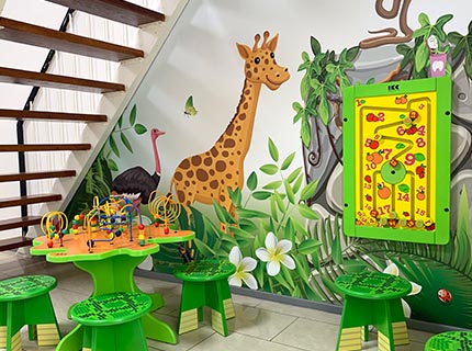 Kinderen kunnen zich vermaken met verschillende wandspellen, waaronder ons 17inch touchscreen, hierop kunnen kinderen interactief spelen. Educatie staat hoog in het vaandel bij IKC en dit is terug te zien in de software. Kinderen leren van alles over dieren, cijfers en letters. De wandspellen en de speciale kralentafel daagt kinderen uit om hand/oog coördinatie spelenderwijs te stimuleren. Een speelconcept van IKC heeft een positief effect op kinderen!