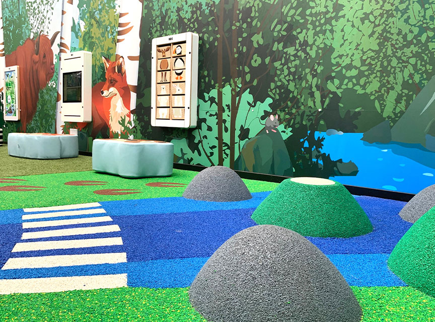 Het restaurant biedt uitkomst voor 200 personen, de kinderhoek is een echte eyecatcher in de ruimte. Het gebruik van natuurlijke elementen op de muur maakt dat kinderen het gevoel krijgen buiten te spelen. Dat maakt deze kinderhoek passend voor het tuincentrum. Veiligheid staat voorop, daarom is gekozen voor een EPDM vloer. Kinderen kunnen hier veilig op spelen zonder zich te bezeren. IKC ontwerpt en produceert deze vloeren zelf, dat betekend dat wij voor elke ruimte en in elke huisstijl een vloer kunnen produceren.