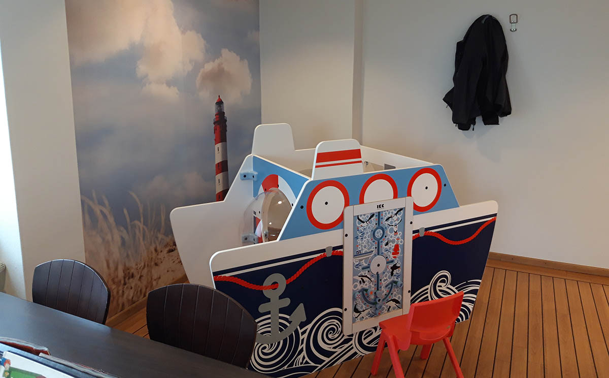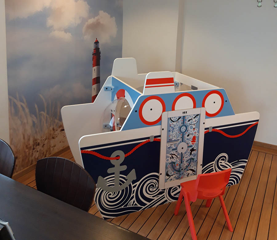 The play corner is made in the design of our Arctic collection and contains a play system in the shape of a boat with play modules in the same theme. A fun play corner full of positive distractions. Waiting has become child’s play! This way, the waiting period is more pleasant and relaxing, making it easier for visitors to prepare for the upcoming consultation.
