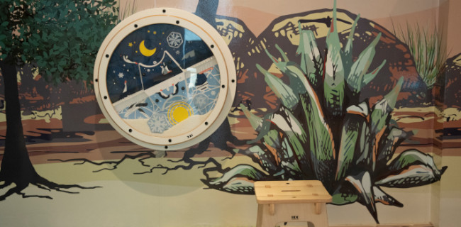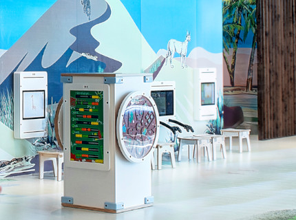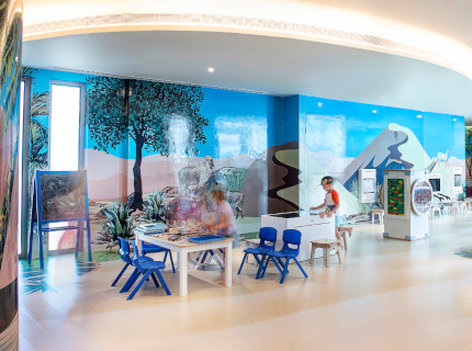 With a relaxing cinema zone for the younger children and a PlayStation zone for the teenagers, it fulfils all needs. The cinema zone is equipped with soft play cushions and wireless headphones, so that children can watch a film in complete relaxation. The play area is fully customised and the custom theme is the local nature and the animals that live in the Arabian desert. From the play floor to the wall coverings, nature is everywhere.