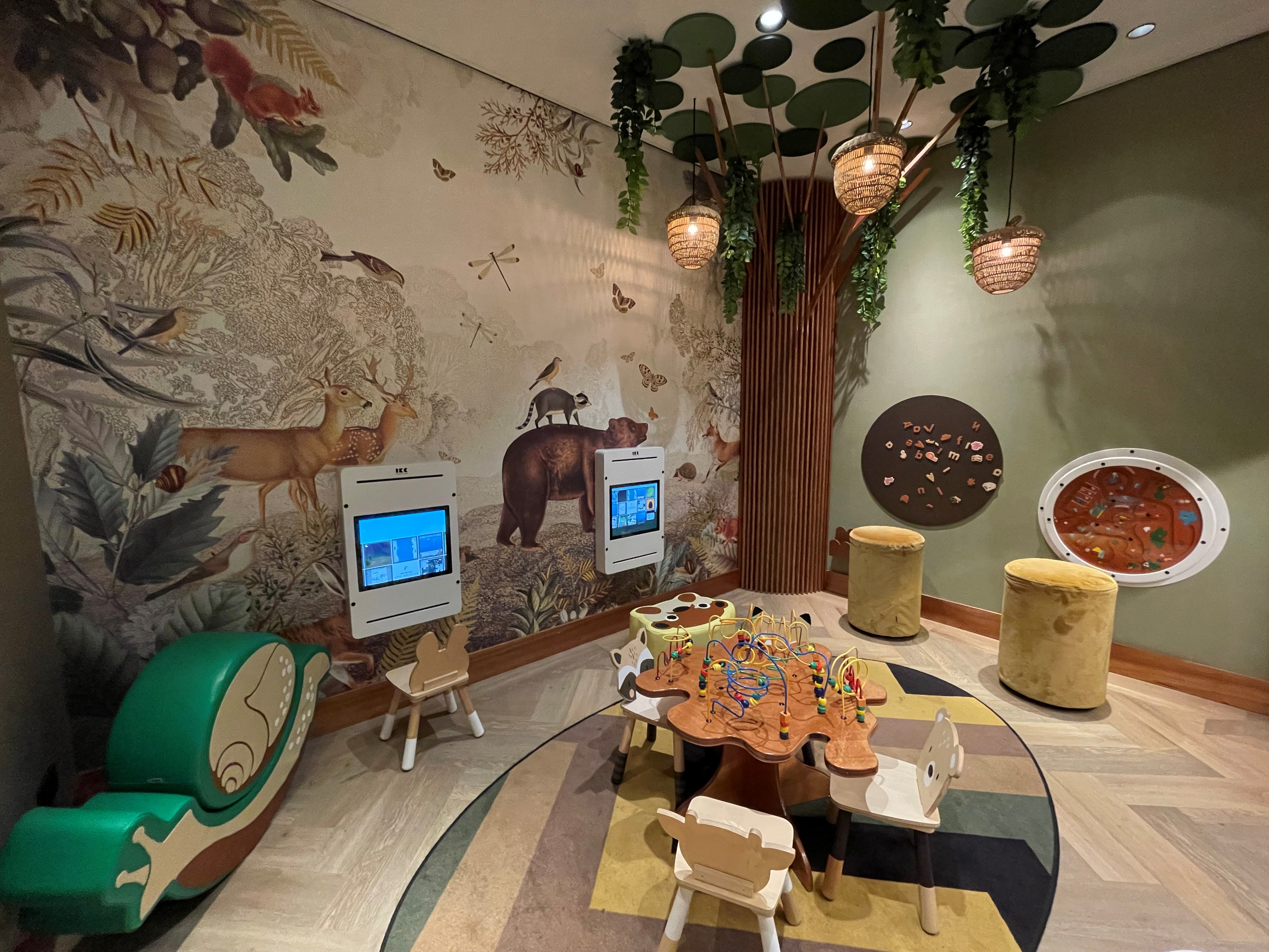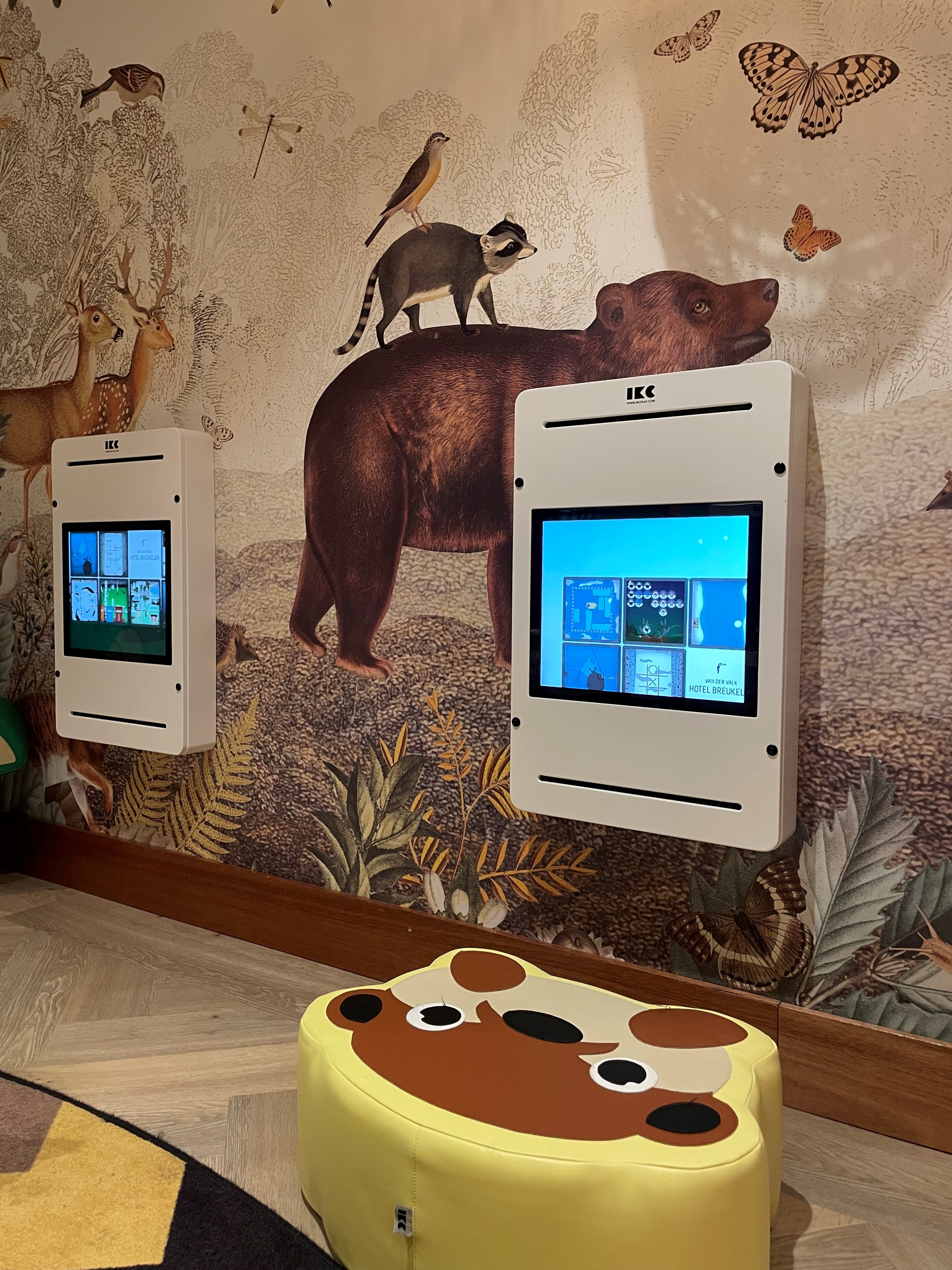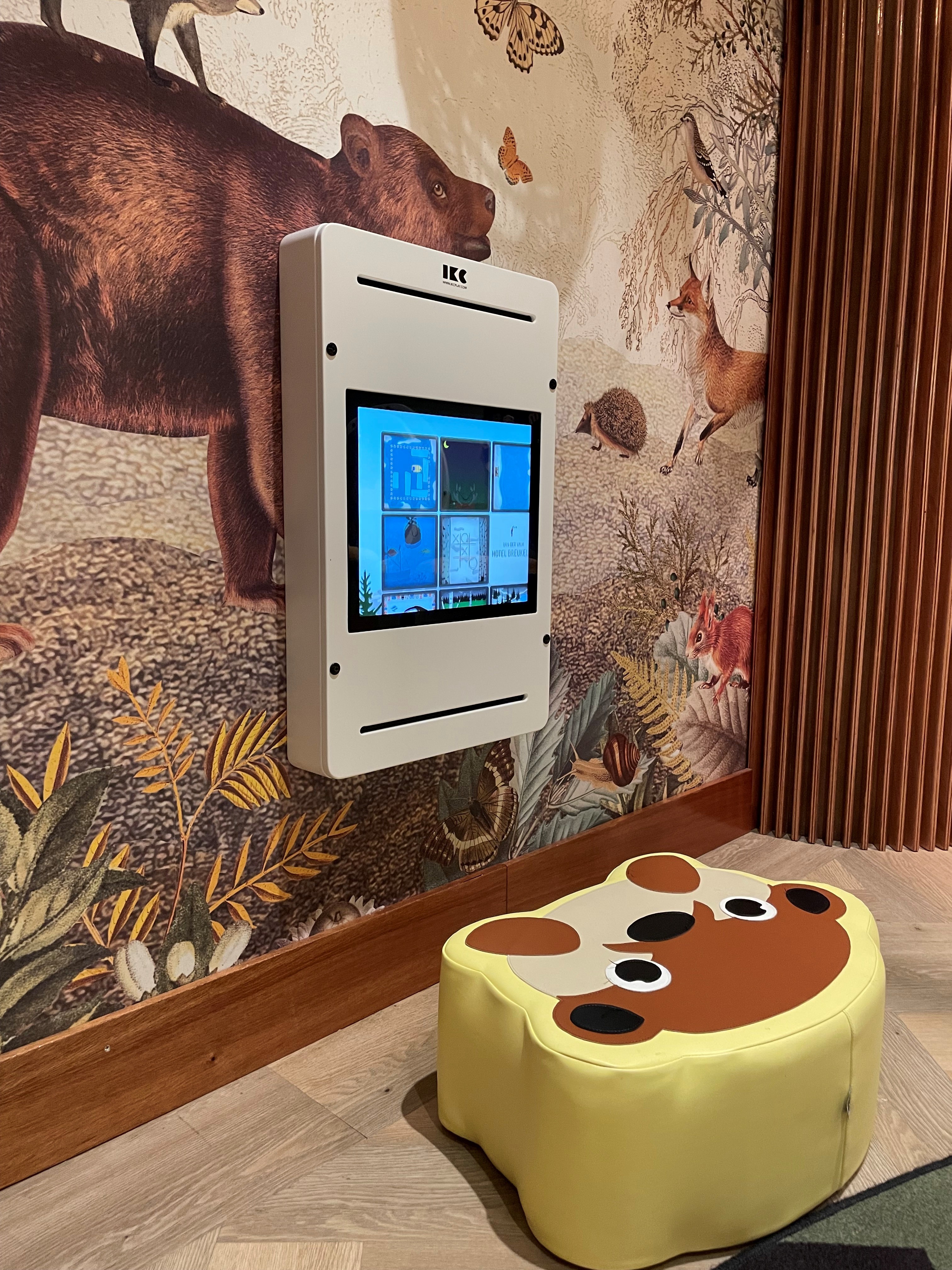 The children's corner offers a combination of analog and interactive play, including a custom soft-play Otto in soft yellow. The play corner fits seamlessly into the warm atmosphere of the restaurant.