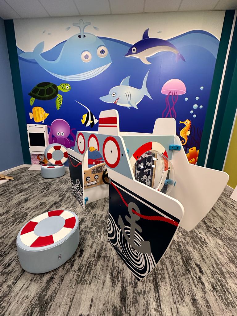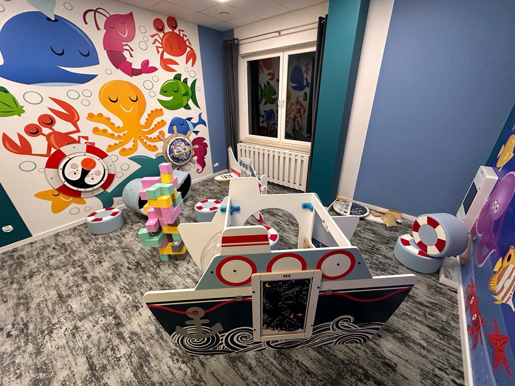 The playroom is equipped with high-quality, sustainable play solutions that stimulate creativity, develop observation skills, and improve concentration. Every element was carefully selected to provide children with both educational and entertaining play experiences.