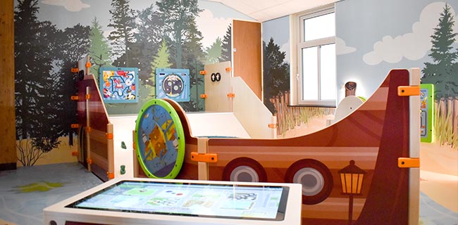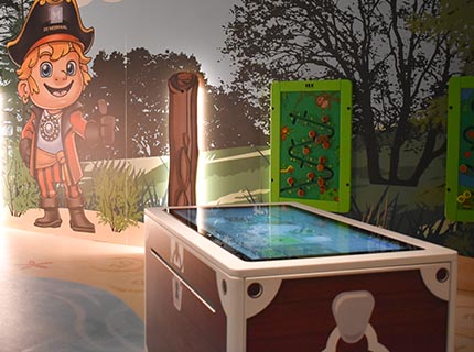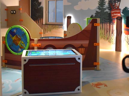 We transformed the 32 inch touchtable into a large treasure chest. With this treasure chest children can have fun by playing various interactive games. To complete the experience, we placed a fence combination to look like a pirate ship.