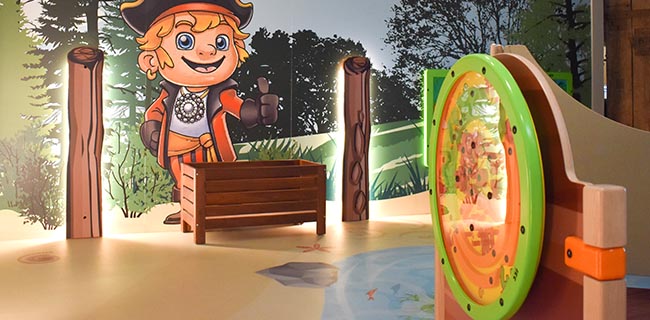 The management requested the creation of a area where children can play in a themed environment. IKC created the play corner in a Pirate Theme. We included the wall and floor decoration. Here, children will encounter different pirate elements.