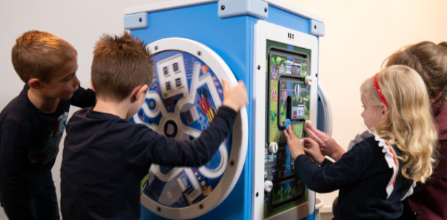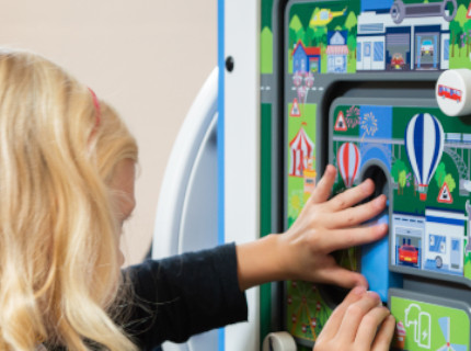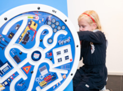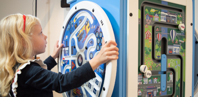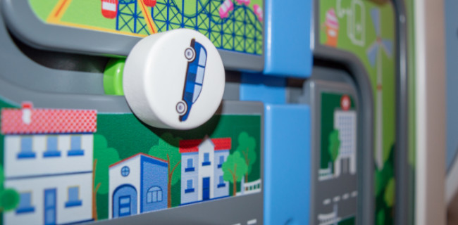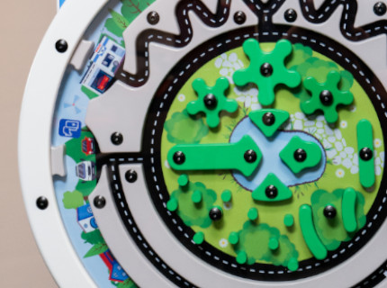 The Memory game contains 24 blocks where children can match tools, the Bosch logo is displayed on the back of the blocks. With Apple Pie Factory, children can move the buttons with vehicles through the village. They can visit the circus or the garage! The round wall games can be rotated by children to guide the cars of the Road Trip and the balls of the Spinball through an obstacle course. This supports the development of hand-eye coordination and the ability to react. Fun and educational!