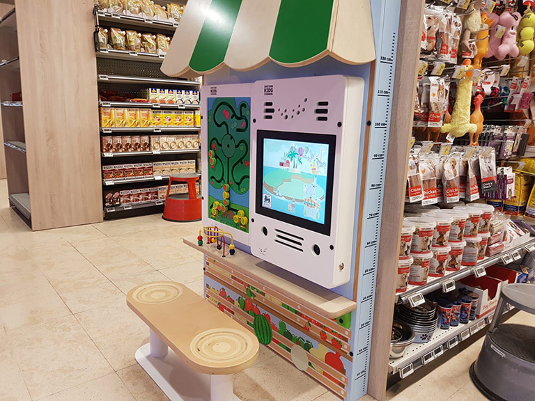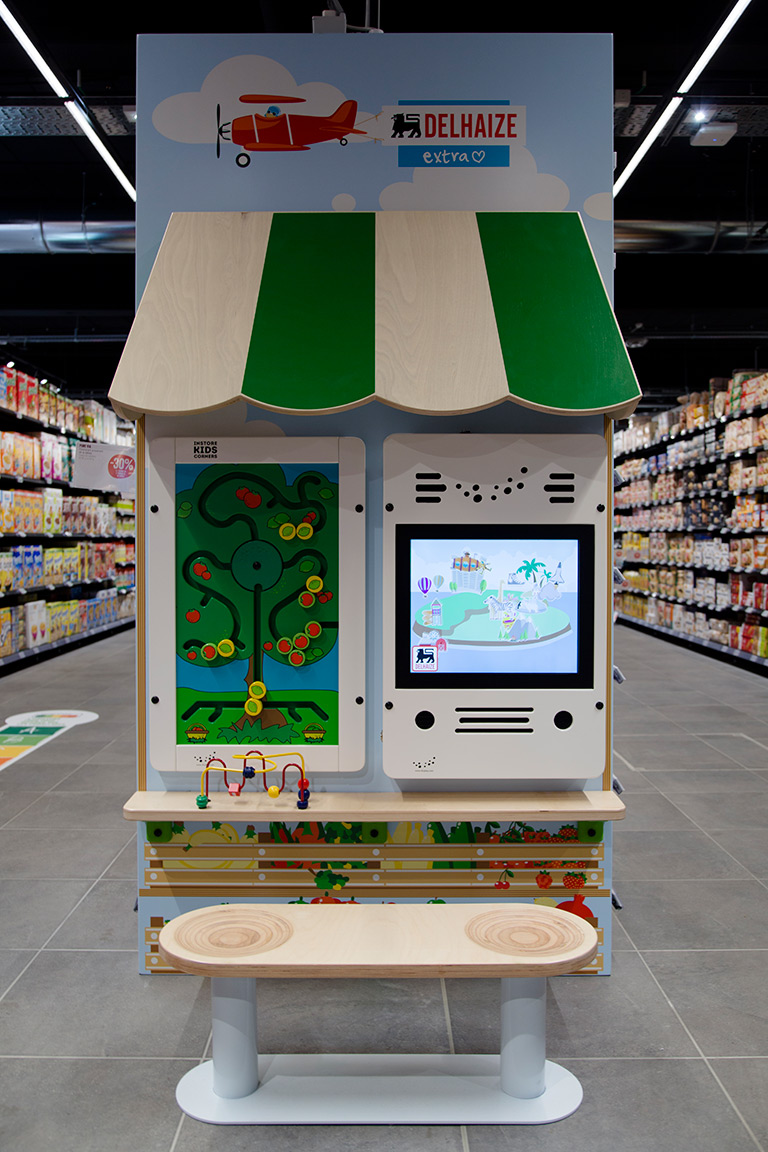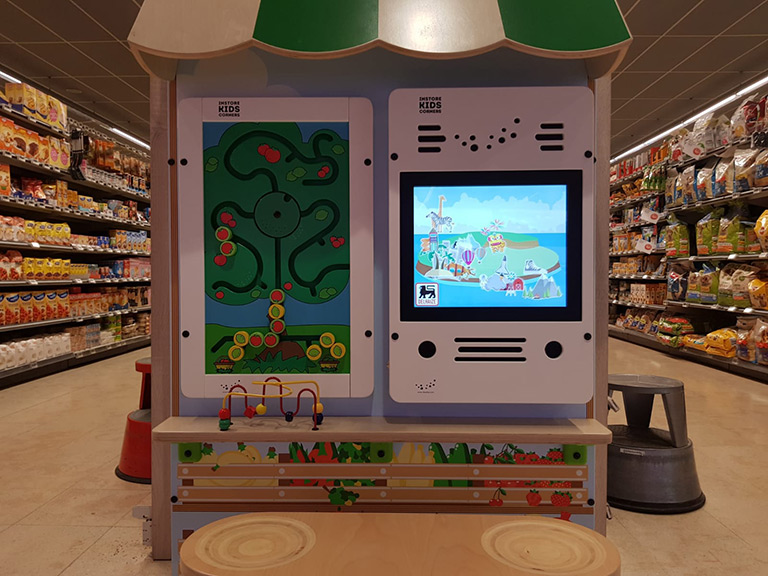 The Delhaize kids' corners offer play value to children of all ages. With an IKC sorting tree and wire beads, the youngest visitors can sort apples and beads and work on their fine motor skills. For kids from the age of 4, an interactive play system with supermarket games was added. The special Supermarket software contains 11 games with themes like farm, fruit, nature and family. All games are custom made, designed by our own game developers.