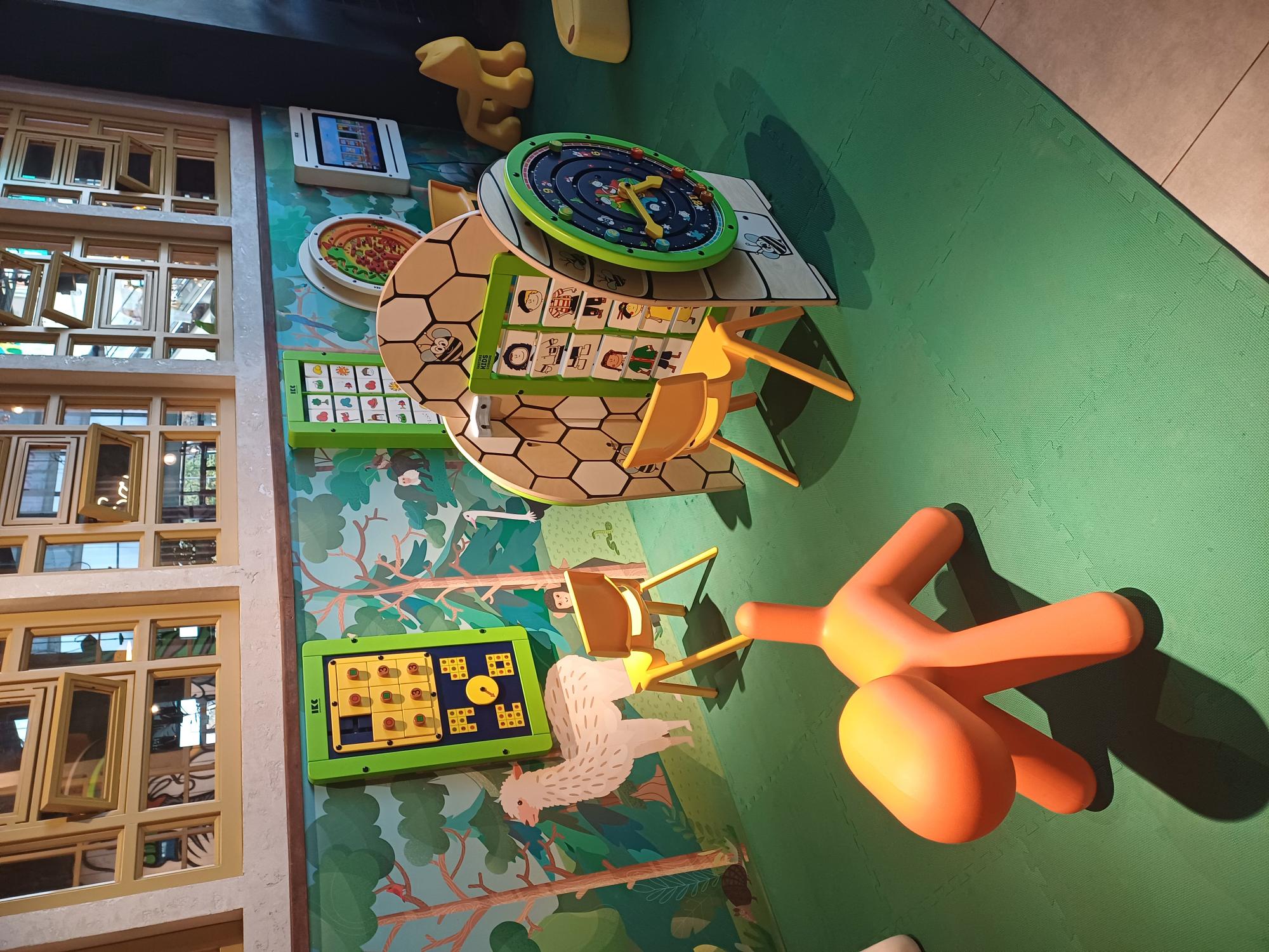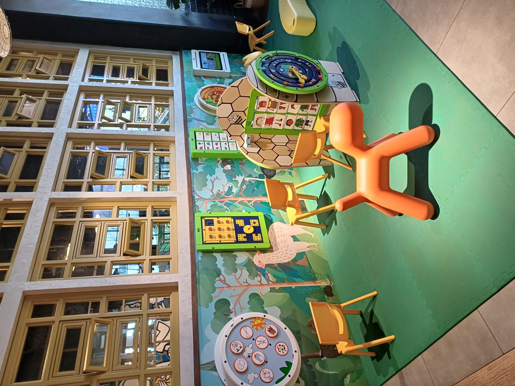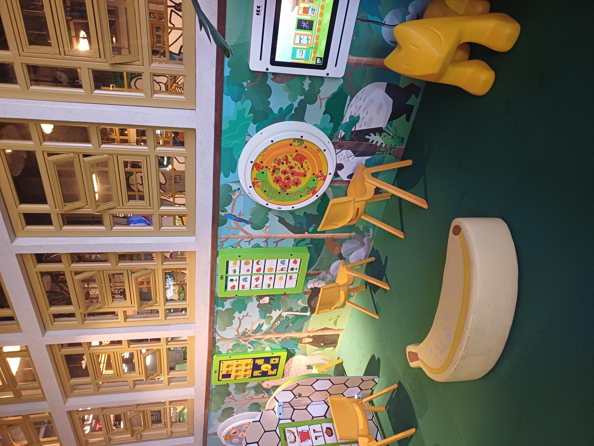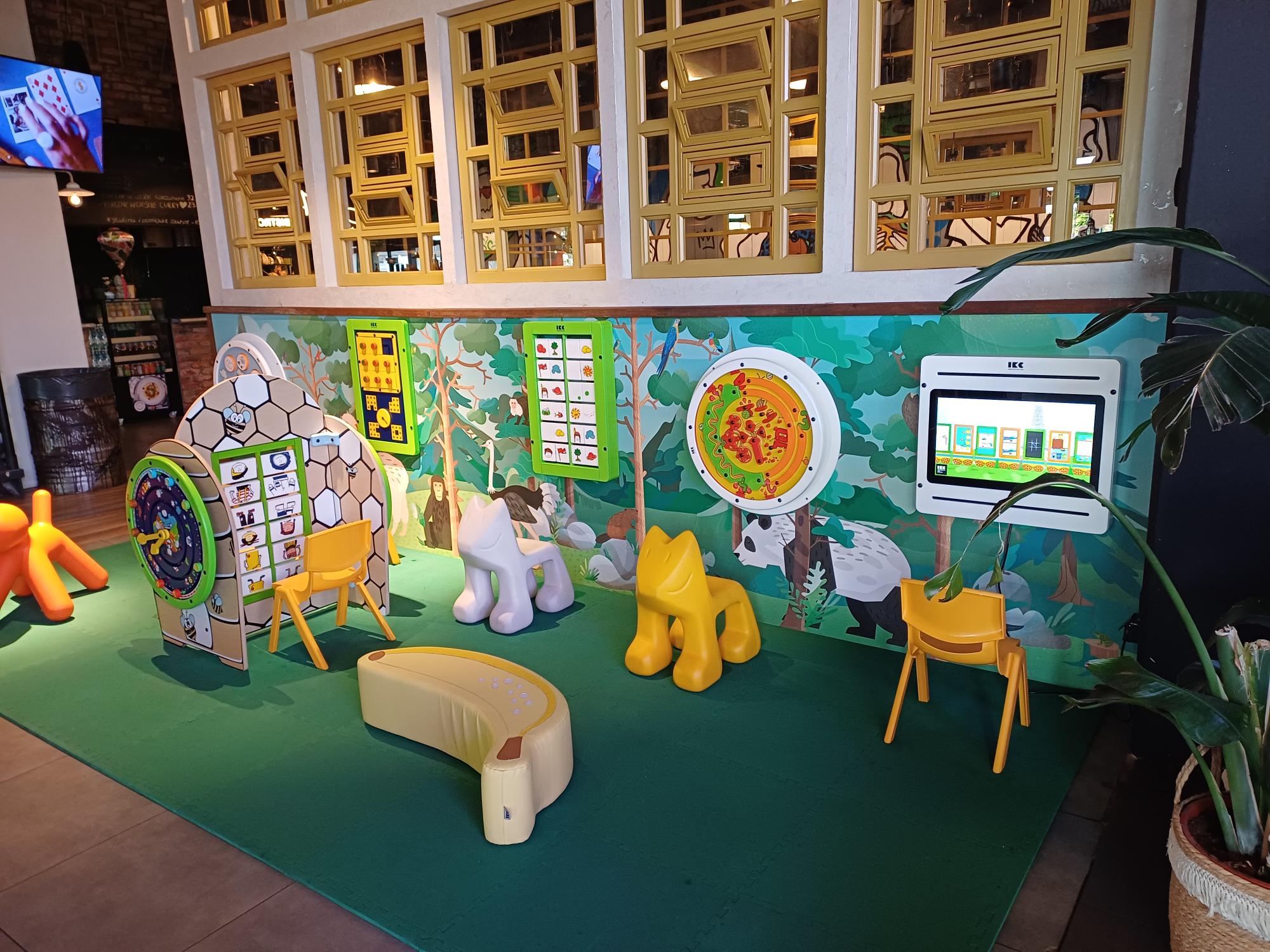 International Kids Concepts collaborated with the client to design and create a complete kids corner equipped with wall games, an interactive screen, and durable, child-friendly seating. The classic IKC wall games can be found in the play area, such as the Square Logic, Dress Code, Spinball and Clock Around. The fun chairs add an extra pop of colour while being versatile within the space. The installation also includes vibrant wall graphics and soft flooring that enhance both safety and aesthetic appeal, making it a delightful spot for kids to play. A banana soft play is also featured for a dynamic play element.