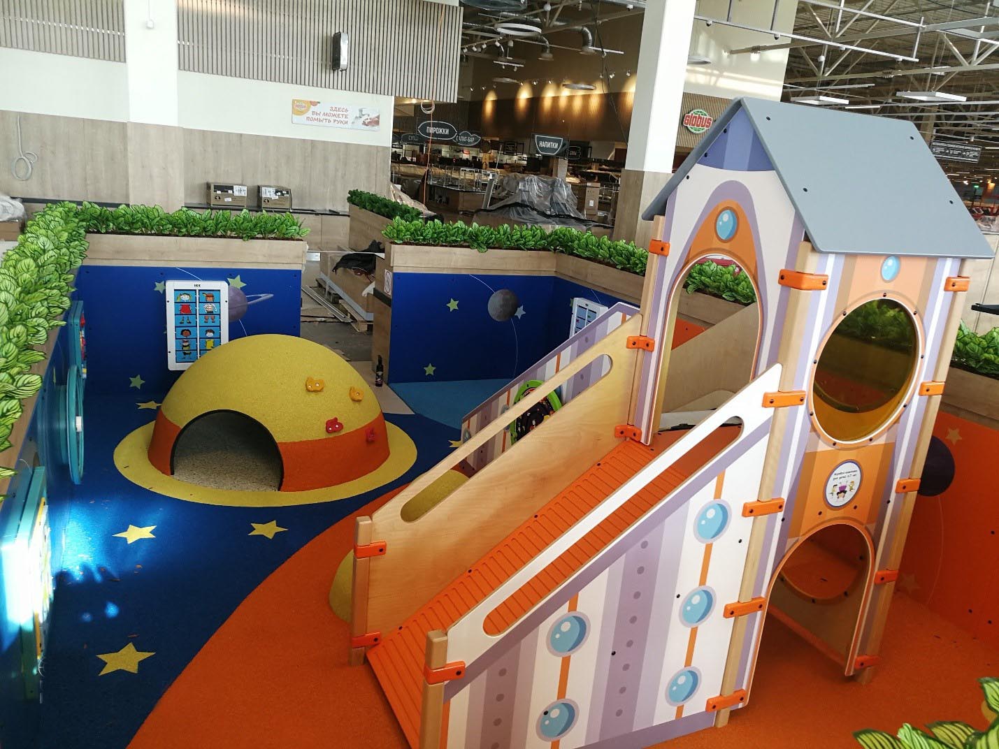 Наши дизайнеры совместно с заказчиком спроектировали детскую игровую зону в фирменном космическом стиле компании Globus.