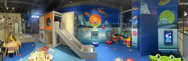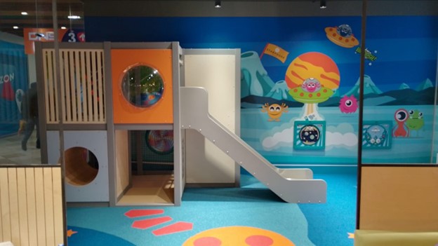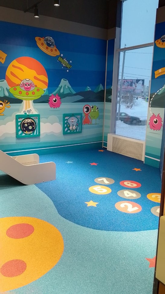 Игровая зона площадью 30 м2 спроектирована нашей компанией специально для детей разных возрастов от 1 до 16 лет.